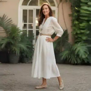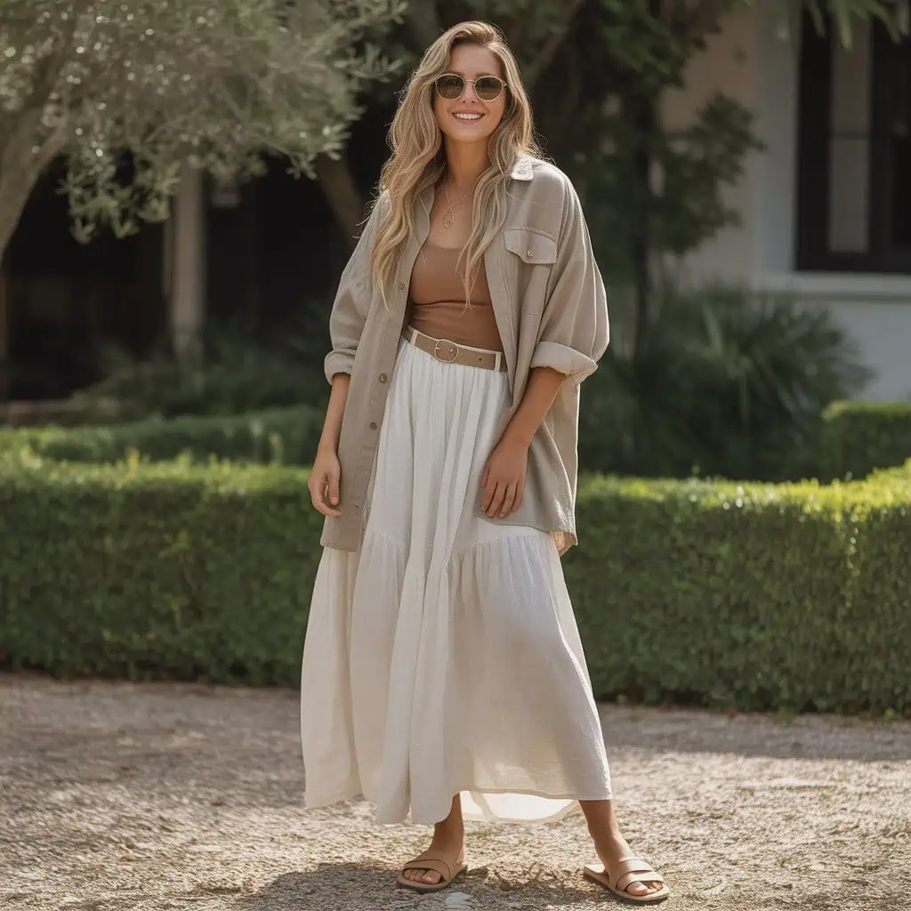Combining a relaxed overshirt with a flowy skirt is a brilliant way to blend comfort and flair. An oversized linen shirt has that nonchalant cool factor, while tucking it into a softly billowing skirt creates an effortlessly chic profile. The beige tone of the shirt beautifully complements the airy white skirt, fostering a harmonious, summer-ready palette. Don’t underestimate the power of nice heels; they provide a sophisticated edge without overshadowing the laid-back essence of the outfit. Perfectly styled, this look embodies the essence of leisurely outdoor gatherings, ensuring you stay stylish without sacrificing comfort.