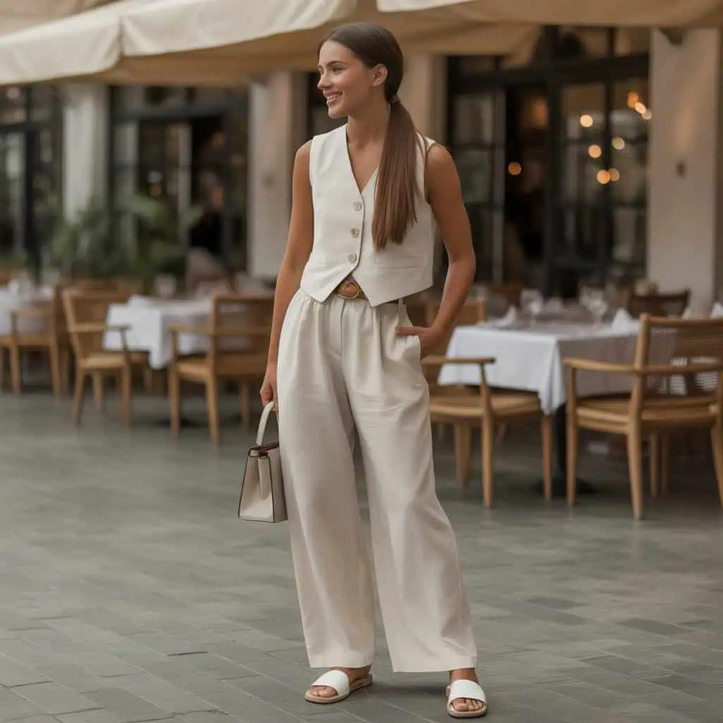 Embracing a monochromatic palette can lead to a strikingly elegant look, especially with a well-coordinated linen vest and palazzo pants set. This outfit exemplifies modern minimalism while keeping things fresh, thanks to the cinched waist that outlines the figure beautifully. Selecting a cream hue lends a sophisticated air, while the easy-to-wear slide sandals amplify the laid-back sensibility. The structured handbag complements the look by adding a dash of formality, making it suitable for both casual meet-ups and chic lunches. The sweeping fabric of the palazzo pants captures the wind, allowing you to remain cool while looking effortlessly styled.