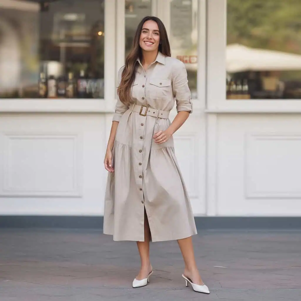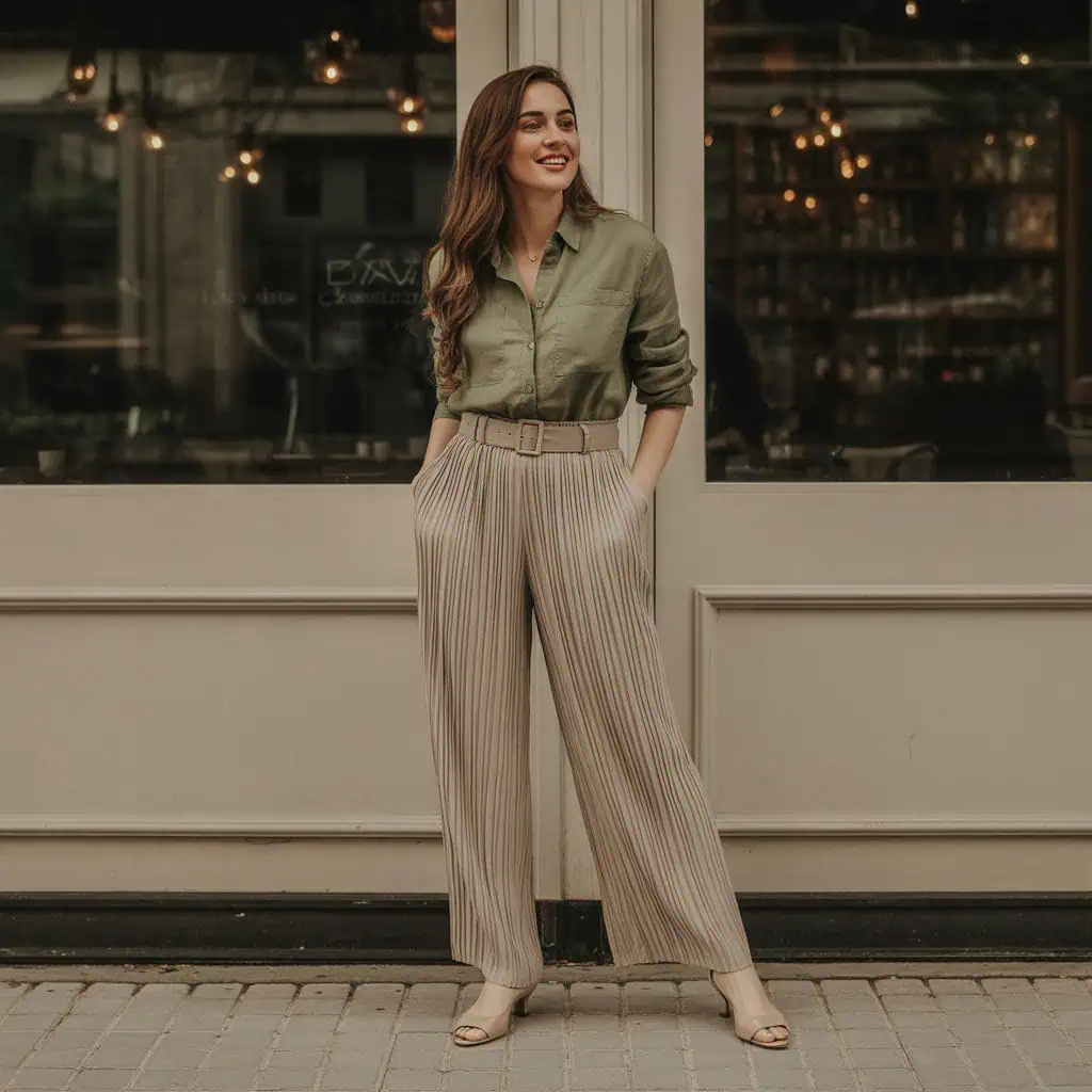 Incorporating a linen utility shirt into your wardrobe is an effortless way to embrace a modern, utilitarian aesthetic. The olive green hue adds a pop of sophistication, while the breathable linen fabric keeps you fresh throughout the day. Tucked into beige pleated wide-leg trousers, this outfit presents an effortlessly polished look that’s perfect for both work and leisure. The pleats not only provide movement but also add depth and dimension to the trousers, enhancing your overall silhouette. White kitten heels keep it classy yet comfortable, allowing you to transition smoothly from day to night. This combination marries practicality with style effortlessly, making it an ideal pick for any fashion-forward individual.