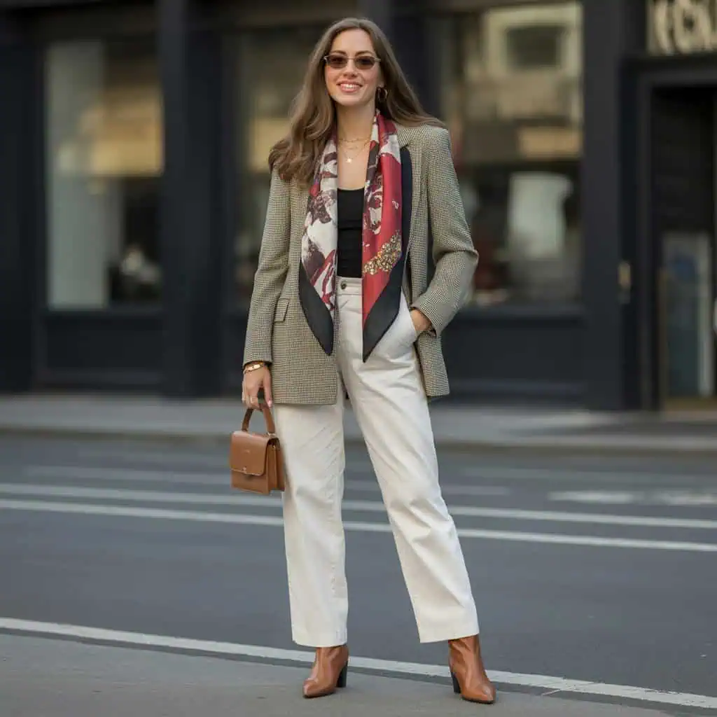 A bold print scarf adds personality and flair to any outfit, transforming a simple look into a chic statement. When styled with a tailored blazer, as seen here, the scarf doesn’t just add color but also injects a dose of sophistication. The fitted black tank keeps the look seamless, allowing the focus to remain on that eye-catching scarf. Pairing this with crisp white trousers offers a refreshing contrast, while black ankle boots with a pointed toe lend an elegant touch. Complement with delicate gold jewelry for a hint of sparkle, making this ensemble perfect for work meetings or evenings out. Embrace this styling for a blend of professionalism and personal flair.