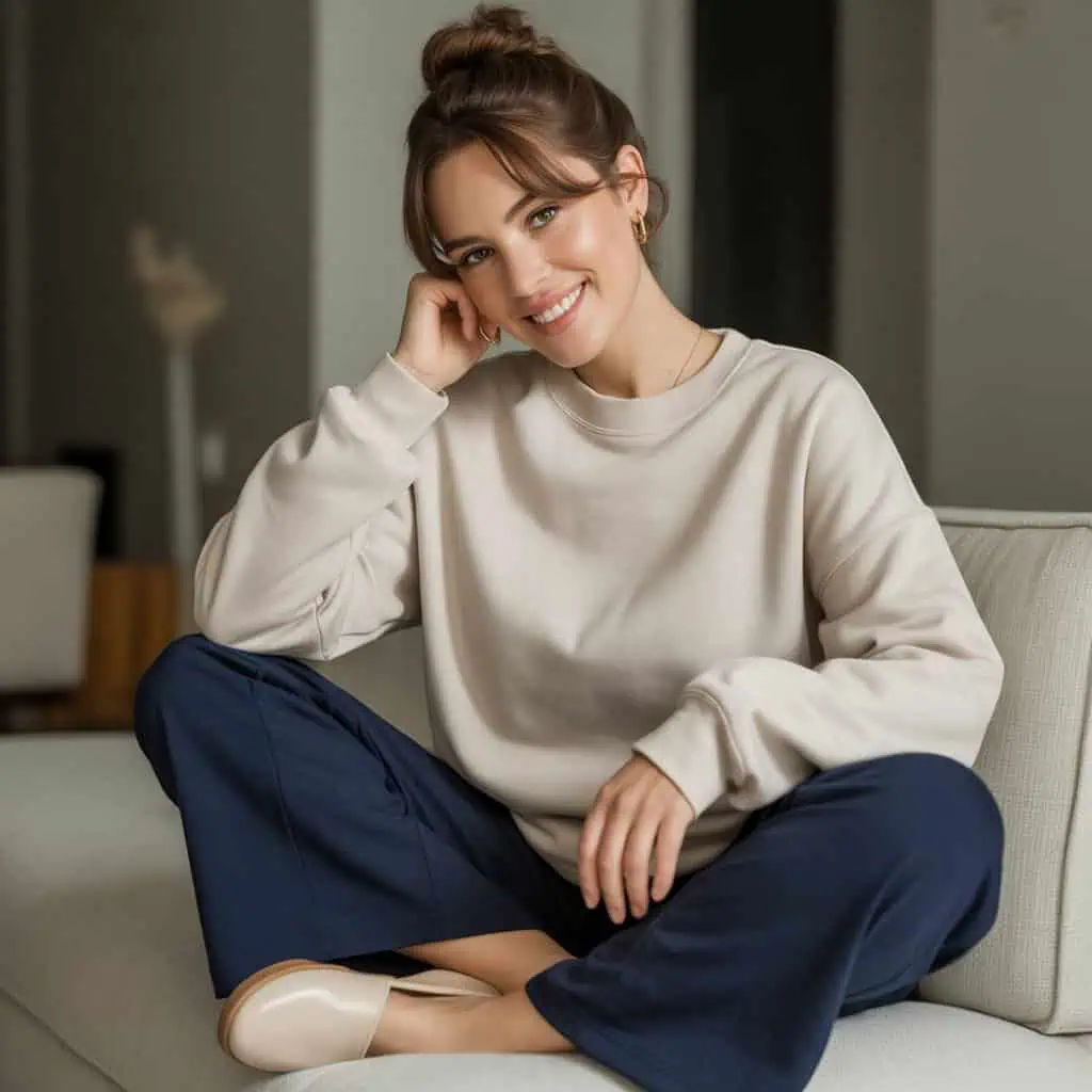 A cream crewneck sweatshirt paired with wide-leg navy trousers is a brilliant combination for those who seek comfort without sacrificing style. The soft texture of the sweatshirt provides a relaxed vibe, while the tailored silhouette of the wide-leg pants adds a sophisticated touch. This outfit works because the color palette remains neutral yet intriguing, allowing for easy accessorization—tiny gold huggie earrings elevate the look without overwhelming it. Slip-on cream flats add practicality and become an easy, chic finish to the ensemble, making it perfect for leisurely days at home or casual outings.