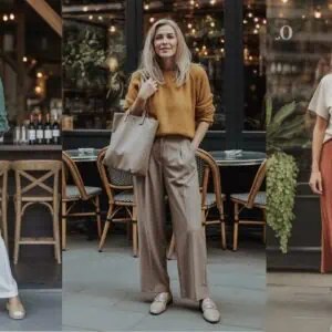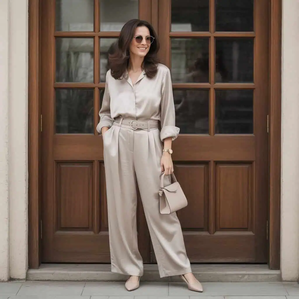 Embracing monochromatic tones can elevate the elegance of any outfit, and the combination of beige wide-leg pants with a plush silk blouse is a testament to this. The flowing silhouette of wide-leg trousers creates a flattering shape, giving off a relaxed yet polished vibe. When paired with the luxurious sheen of silk, the ensemble embodies sophistication, making it perfect for both casual outings and more formal events. The soft beige palette also lends itself to versatility—accessorizing with minimalist jewelry and refined bags can enhance the overall look without overwhelming it. This flawless blend of textures keeps the outfit visually interesting while remaining effortlessly chic.