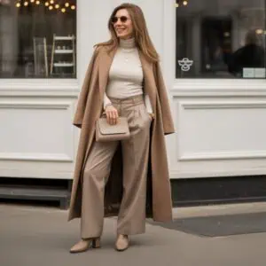 Choosing a monochrome look in neutrals brings a level of sophistication that’s hard to beat. Shades like beige, taupe, and cream not only elevate your outfit but also create a seamless visual flow that’s pleasing to the eye. Wide-leg trousers paired with a high-neck top add an airy feel, making this combination both chic and comfortable. When accessorized with gold jewelry and structured bags, you achieve an effortlessly elegant finish that catches attention without shouting for it. This minimalist approach makes dressing easy, allowing you to adapt the outfit for various occasions, whether at an art gallery or on a casual day out.