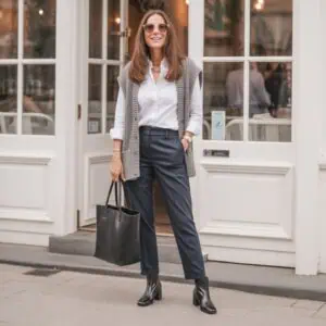 Prioritizing comfort through footwear doesn’t mean sacrificing style, and this outfit beautifully illustrates that point. A soft grey oversized t-shirt tucked into high-waisted black wide-leg trousers creates a laid-back yet chic silhouette that flows organically. When you choose flat black leather ankle boots, you enhance the comfort factor while adding a sleek touch. The structured tote bag and layered gold chains offer subtle refinement, complementing the relaxed vibe perfectly. Oversized sunglasses contribute an air of mystery and polish, making it easy to feel confident and authentic in your outfit, whether you’re on a leisurely stroll or out running errands.