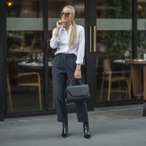 A simple black outfit is a timeless choice that always exudes elegance and confidence. The sleek black turtleneck paired with tailored black trousers creates a streamlined silhouette, perfect for any occasion from coffee dates to evening gatherings. The slight contrast of softer charcoal in the trousers adds depth to the ensemble, while the monochrome palette ensures a sophisticated, chic appearance. Accessories like structured black sunglasses and a handbag serve to enhance the look without overwhelming it. This ensemble is the epitome of effortless style—it allows you to feel comfortably put together, proving that sometimes less truly is more in the world of fashion.
