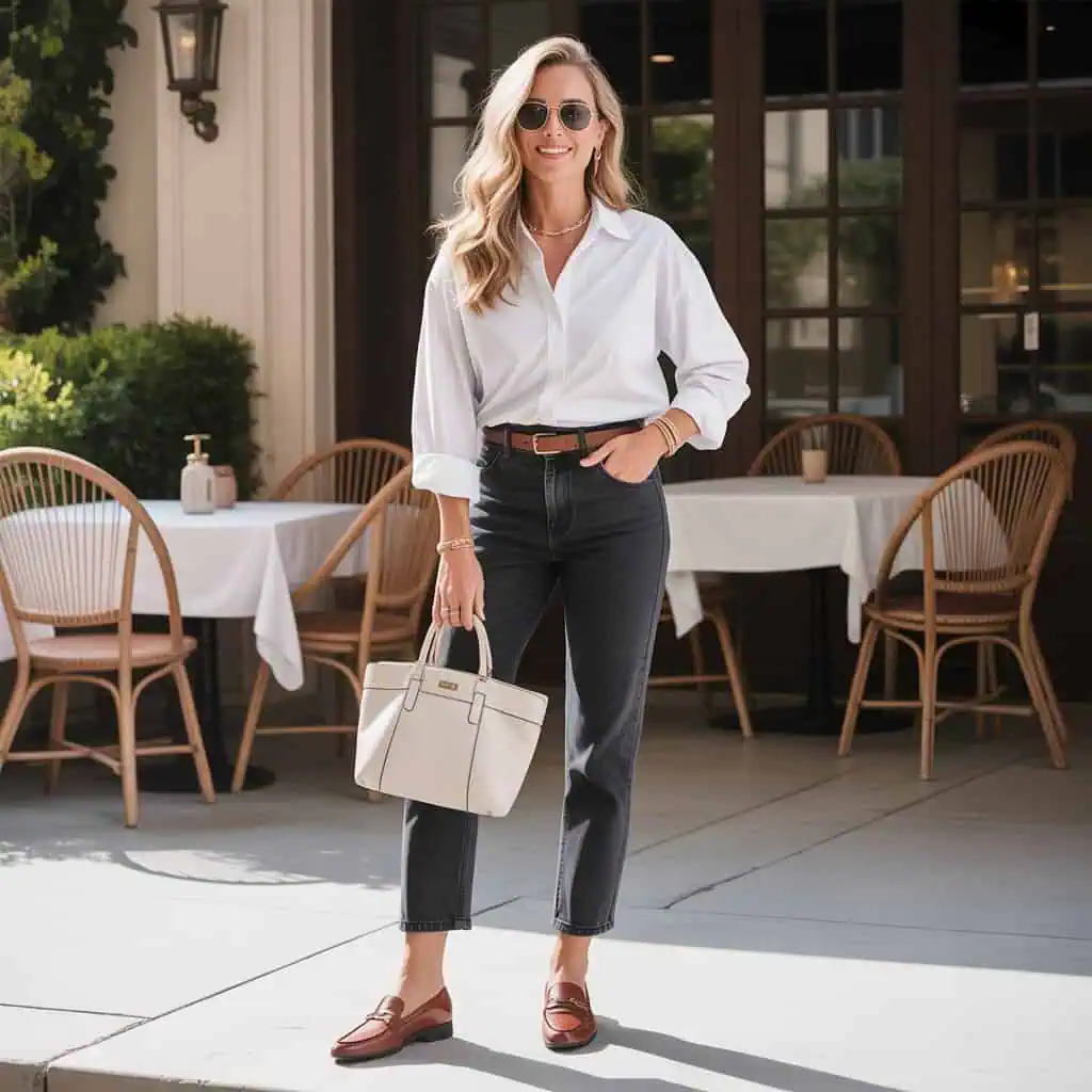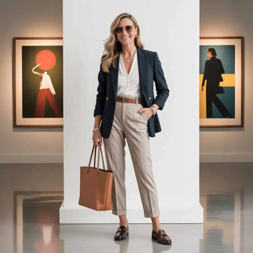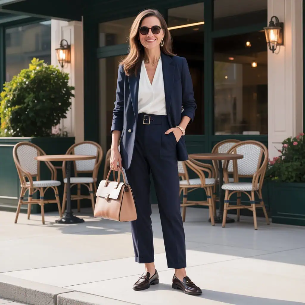 The significance of a structured handbag cannot be overstated; it’s an accessory that speaks volumes about your personal style. This piece injects a sense of purpose and polish into any outfit, embodying the confidence that comes from knowing you’ve got your look together. When paired with a fitted navy blazer and a tucked-in white blouse, the structured handbag stands as a complement that enhances the overall aesthetic. It brings a sense of formality while maintaining ease, especially when topped off with classic loafers. The combination effortlessly transitions from professional meetings to casual outings, making it an essential companion for any confident woman over 50.