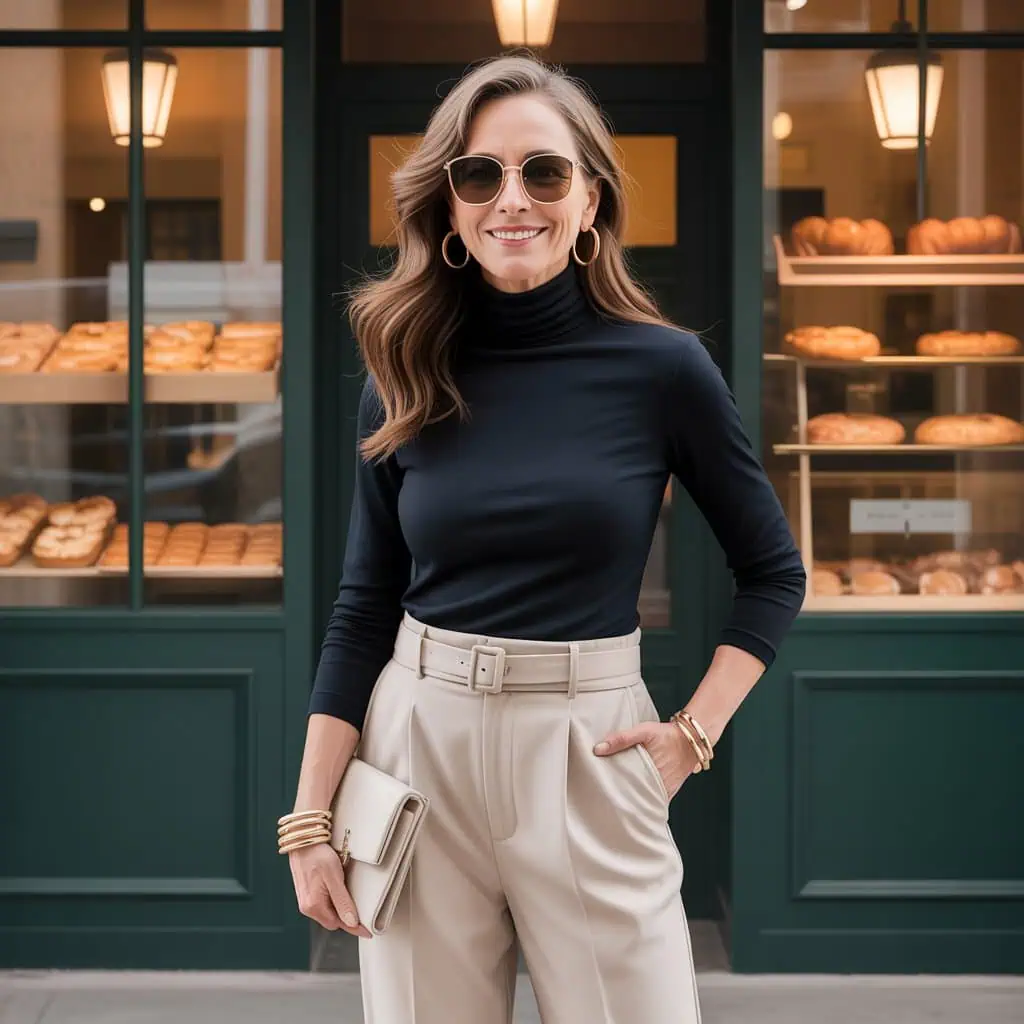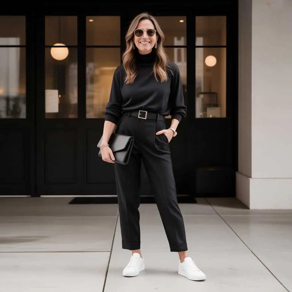 Choosing a monochrome outfit is a fantastic way to convey sophistication and confidence, especially after 50. An all-black ensemble, like belted tailored trousers paired with a relaxed-fit turtleneck, creates a streamlined silhouette that feels both effortless and put-together. The monochrome palette elongates the body visually, while the contrasting textures of the top and trousers add depth without overwhelming the eye. Accessorizing with minimal jewelry and a sleek clutch keeps the look chic, while clean white sneakers add a modern twist, ensuring comfort. This combination not only flatters but also communicates a sense of empowerment and style mastery.