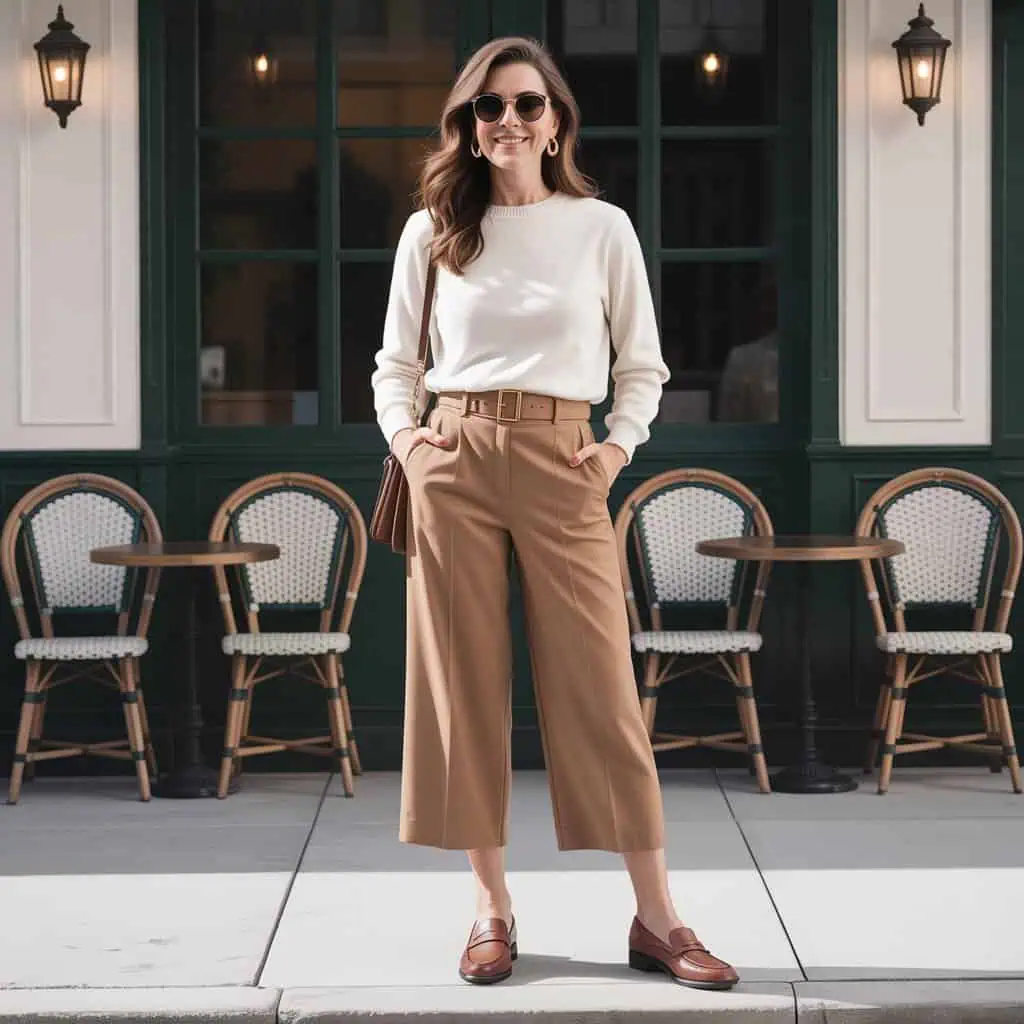 The resurgence of polished loafers has made them a must-have for anyone looking to combine comfort with style. These versatile shoes can easily transition from day to evening, making them ideal for a busy lifestyle. Pairing them with tailored culottes and a sleek, tucked-in cream sweater creates a harmonious balance that speaks volumes about your sense of aesthetic. The structured silhouette of the culottes, complemented by the loafers, creates an elegant yet relaxed vibe, perfect for feeling self-assured. When you add subtle accessories like minimal earrings and cat-eye sunglasses, you’re showcasing not just your outfit but your confident personality as well.