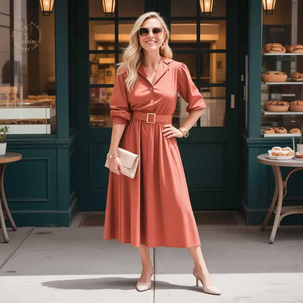 A midi dress is perfect for showcasing confidence, particularly because it strikes that ideal balance between elegance and ease. The knee-length cut offers a chic nod to modern silhouettes, while cinching at the waist highlights your figure wonderfully. Opting for a solid color allows the dress to serve as a canvas for your accessories, inviting creativity without overwhelming the look. Pairing it with classic kitten heels not only adds height but also maintains comfort—perfect for all-day wear. Accessorizing with a clutch and oversized sunglasses rounds out the outfit, presenting you as stylish and self-assured in any setting.