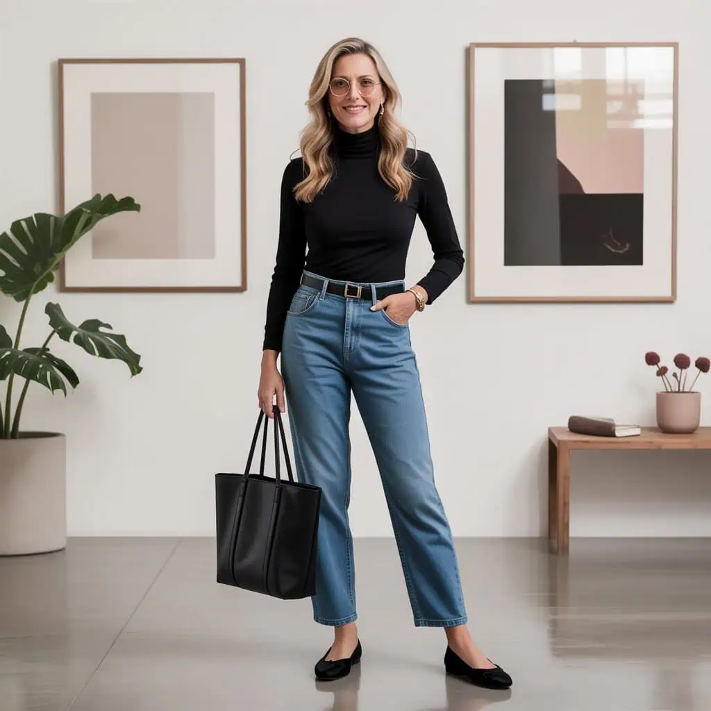 Straight-leg denim is an evergreen wardrobe staple that balances comfort with style, making it an excellent choice for effortless confidence. The clean lines of straight-leg jeans flatter a variety of body shapes, providing a streamlined silhouette without clinging too tightly. Tucking in a fitted turtleneck not only emphasizes the waist but enhances the sophisticated vibe of the look. Pairing these jeans with ballet flats keeps the outfit chic yet approachable, while a stylish tote bag and minimal jewelry add just the right touch of personality. This combination allows you to exude confidence while remaining effortlessly fashionable.