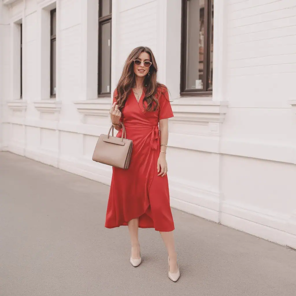 There’s something undeniably captivating about a wrap dress, especially when it’s in a bold color like red that commands attention. This style beautifully accentuates the waist while providing free movement, making it perfect for any body type. By pairing it with neutral pumps, you keep the focus on the dress, allowing its color and cut to speak for themselves. The structured leather handbag adds a modern touch and balances the softness of the dress, while chic sunglasses serve as a nod to sophistication. This outfit embodies the philosophy that sometimes, simplicity in accessories allows the striking elements of your look to take the center stage.
