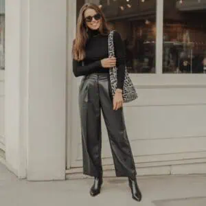 Dressing in a single color palette is one of the best ways to achieve a chic and cohesive outfit. In monochrome neutrals, like beige, the layering of textures—such as a structured turtleneck with wide-leg trousers—creates depth while maintaining simplicity. This approach elongates the frame, making it perfect for anyone over 50 who wants to feel both stylish and comfortable. Accessorizing with cognac leather boots and a handbag introduces richness to the look, while understated gold jewelry adds a touch of refinement without overwhelming the outfit. This ensemble is ideal for those seeking effortless elegance in a minimalist style.