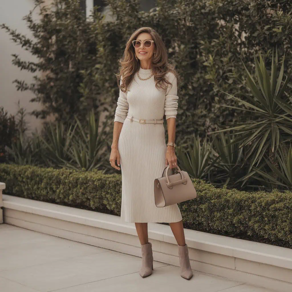 A fitted knit dress is a game changer for effortless elegance, especially when the weather calls for something cozy yet stylish. This particular cream-hued dress flatters the body’s natural curves while providing ultimate comfort, making it easy to wear for long periods. Adding a slim waist belt not only defines the silhouette but also adds a bit of personality to the ensemble. Pairing this look with beige suede ankle boots seamlessly elevates it, providing a laid-back yet polished aesthetic. The oversized neutral sunglasses and structured handbag contribute to a sophisticated vibe, while refined gold jewelry enhances the warmth of the knit fabric, making it an ideal choice for various occasions, from brunch to evening gatherings.