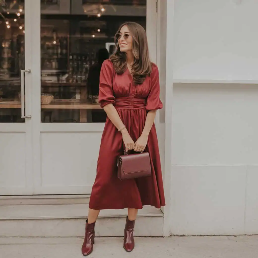 Embracing a single, vibrant hue can create a striking yet sophisticated look. The choice of a cherry red midi dress instantly evokes confidence and energy, while the tailored fit enhances the wearer’s silhouette without overwhelming it. Pairing this bold dress with maroon ankle boots brings an unexpected element that grounds the outfit, allowing the color to shine without being too loud. Oversized sunglasses add a touch of glamour, and the structured maroon handbag offers a modern twist that maintains elegance. This combination proves that a strong monochrome look can be both chic and approachable, perfect for making a statement without resorting to flashy prints.