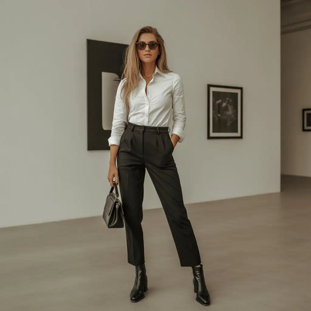 Rocking structured basics is all about achieving that effortless yet put-together vibe. Think of a crisp white button-down shirt tucked into tailored black trousers; this pairing is a classic that transcends trends. The shirt adds a timeless elegance while enhancing your silhouette, and the structured trousers lend an air of authority and sophistication. Black ankle boots complete the look, creating a seamless line from head to toe. When accessorized with oversized sunglasses and a structured handbag, this outfit transcends casual to chic, proving that well-fitted staples can hold their own without needing extra embellishments.