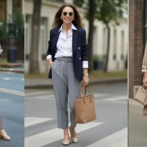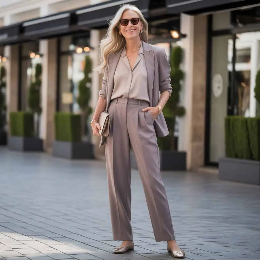 Elevate your look effortlessly with a tailored blazerāthe ultimate wardrobe hero for women over 60. This timeless piece adds polish and sophistication to any outfit. Layered over a tucked-in blouse and paired with sleek pull-on dress trousers, it creates a refined, elongating silhouette that blends comfort with elegance. Polished ballet flats keep the look grounded and wearable, while a small clutch bag and statement sunglasses introduce modern chic. Finished with simple gold jewelry, the ensemble radiates timeless confidenceāshowcasing how a few well-chosen pieces can make every outing feel sophisticated and stylish.