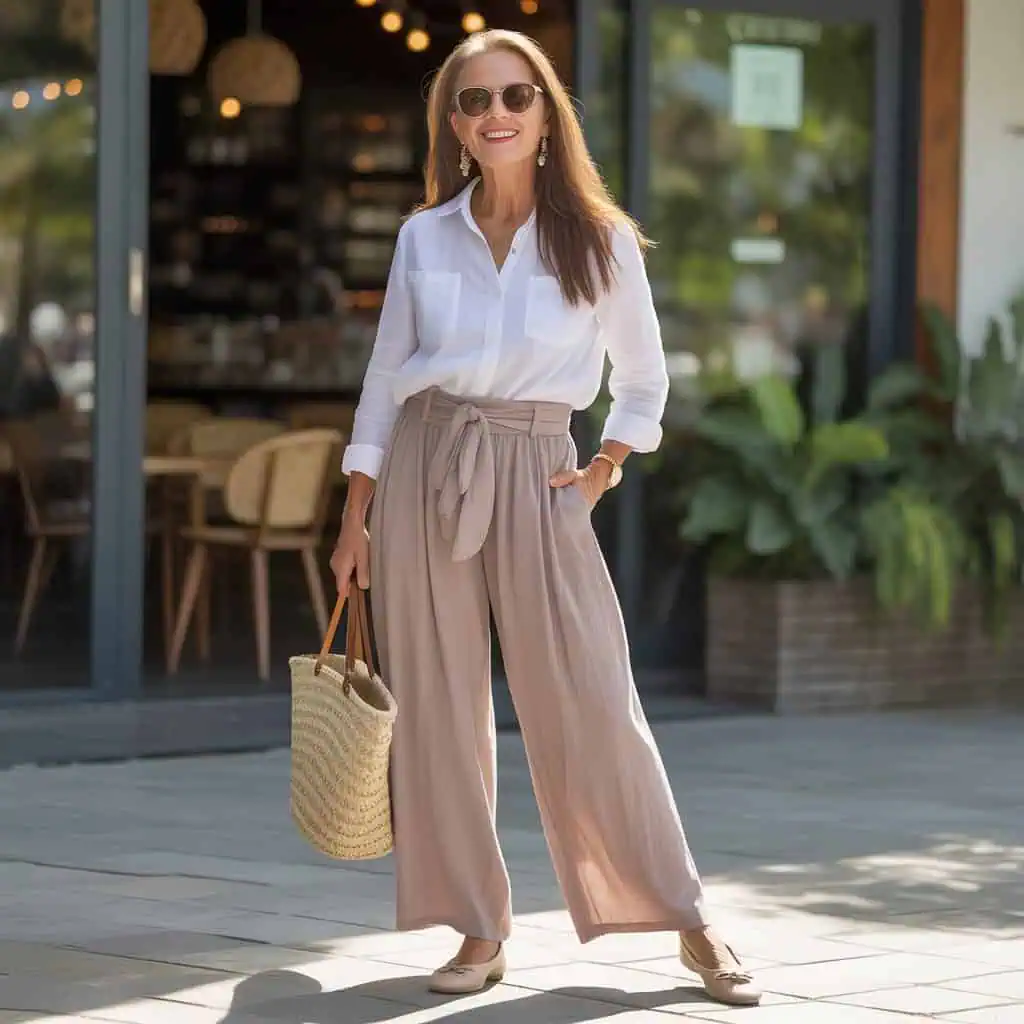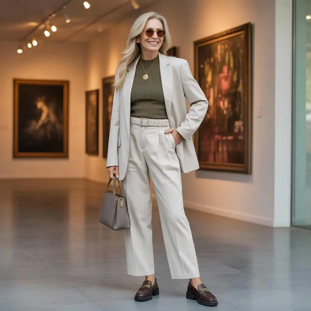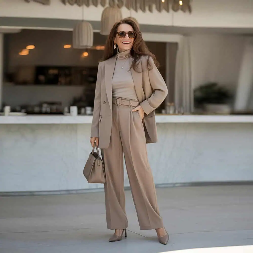 A wardrobe rooted in monochrome neutrals offers timeless sophistication and versatility. This color palette allows for seamless layering, making it an ideal choice for women over 60 who appreciate elegant simplicity without sacrificing individuality. By selecting various shades of beige, taupe, or camel, you create a polished look that elongates the silhouette. The tailored blazer adds structure, while wide-leg trousers instill a sense of ease and comfort. When paired with pointed-toe pumps, this outfit strikes the perfect balance between chic and effortless. Complements like delicate gold jewelry and a structured handbag enhance the refined vibe, ensuring you look both age-appropriate and stylish.