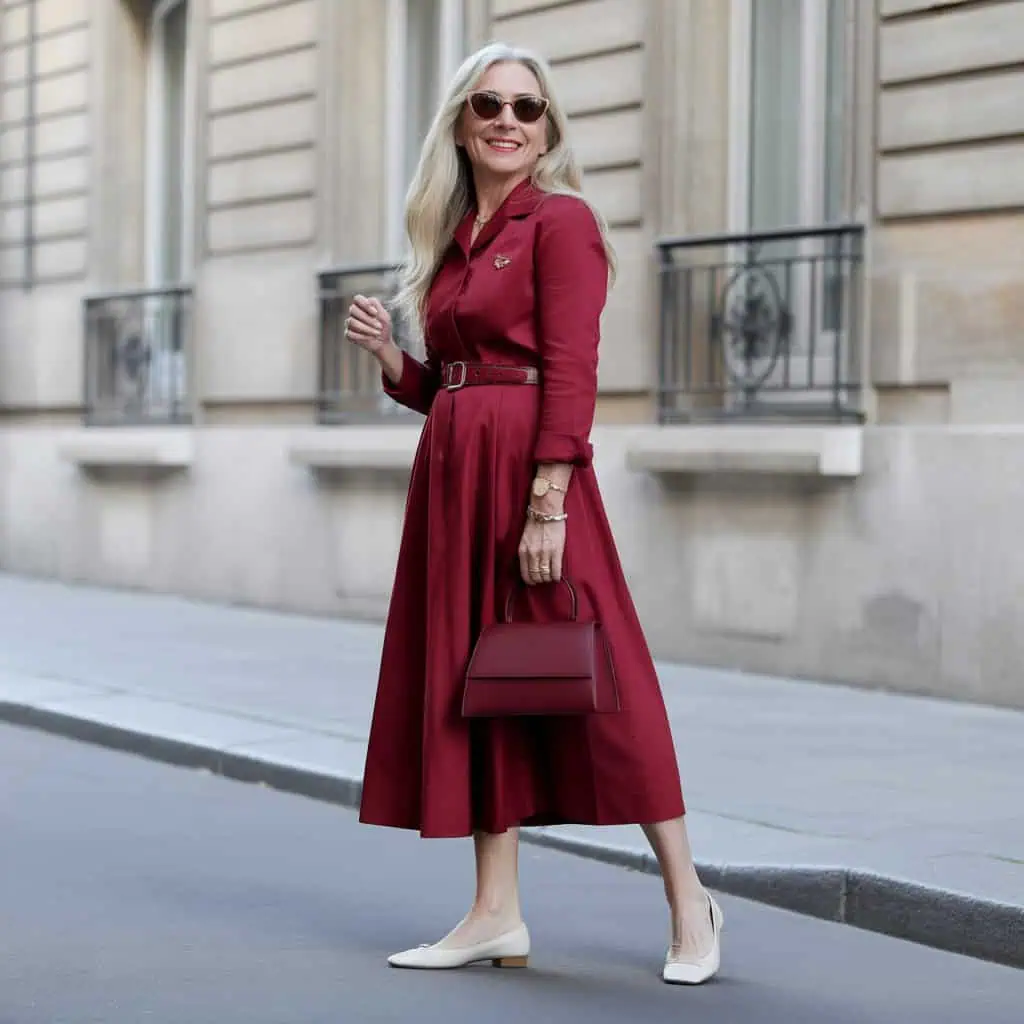 A well-chosen leather handbag serves as both a practical accessory and a statement piece, elevating any outfit instantly. Women over 60 can invest in quality leather, which not only ages beautifully but also brings an air of refinement to casual ensembles. A structured handbag can grace the arm effortlessly, enhancing the overall look. Pairing a cherry red midi dress with a deep burgundy bag creates a delightful color contrast that catches the eye. Accents like minimal gold jewelry maintain an air of sophistication, while the chic choice of footwear ensures comfort. This combination highlights personal style while celebrating the timeless allure of classic accessories.