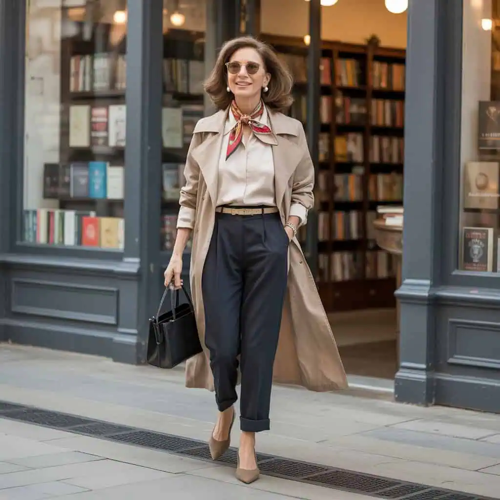Elevating any outfit, a silk scarf is a quintessential accessory that never goes out of style, particularly for the fabulous over-60 crowd. This luxurious fabric instantly adds a dash of elegance and color, transforming even the simplest of looks into a polished ensemble. By incorporating a vibrant silk scarf around the neck, it draws the eye upward and frames the face beautifully. Layering it with a classic beige trench coat and a tucked-in cream blouse creates a refined aesthetic perfect for day or night. Paired with black trousers and dark tan kitten heels, this outfit communicates confidence and grace. A structured handbag and pearl earrings can tie it all together, showing that thoughtful details matter in achieving an effortlessly chic appearance.