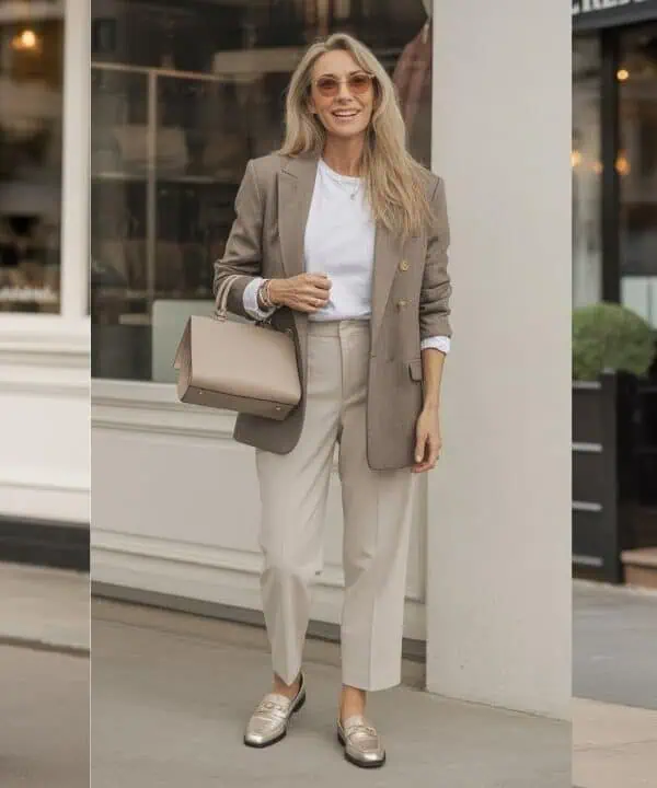 The relaxed linen blazer is a staple that effortlessly combines elegance and comfort, making it an excellent choice for the modern woman over 60. Its breathable fabric is ideal for various climates, allowing you to stay stylish without sacrificing comfort. Pairing the blazer with a simple tank top and cropped pants creates a balanced silhouette—light and airy on top while offering a flattering shape below. The loafers keep the look casual yet chic, perfect for both daytime outings and social evening affairs. Accessories like a fashionable handbag and minimal jewelry elevate the entire ensemble, making it timeless and sophisticated without feeling overdone. Plus, leaving the jacket unbuttoned can lend an air of effortless confidence, allowing for a harmonious blend of style and self-expression!