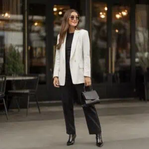 Nothing shouts polished professionalism quite like a blazer, turtleneck, and tailored trousers. The fitted black turtleneck serves as a sleek foundation, offering warmth and elegance beneath the structured blazer. The gray blazer harmonizes with the classic trousers, creating a seamless transition from casual to formal. This combination is versatile, allowing you to dress it up with block-heeled ankle boots or keep it minimal with chic accessories. Oversized sunglasses add a trendy flair, and a structured handbag anchors the ensemble. This look transitions smoothly from day to night, ensuring you’re prepared for any occasion—all while exuding a confident, modern vibe.