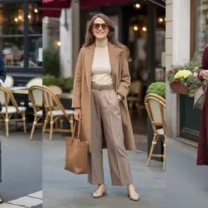 There’s something undeniably sophisticated about deep burgundy that makes it a standout choice for fall attire. This hue instantly elevates your look, embodying warmth while remaining chic and polished. The combination of a knitted sweater and tailored white trousers creates a stunning balance of comfort and elegance. The tucked-in style emphasizes the waist, giving a flattering silhouette, while the neutral trousers allow that rich color to take center stage. Pairing this outfit with black kitten heels keeps it refined, and a structured handbag adds an element of sophistication. Minimal accessories like oversized sunglasses are perfect for a touch of glamour without overpowering the look—it’s about simple, timeless elegance that feels fresh and bright.