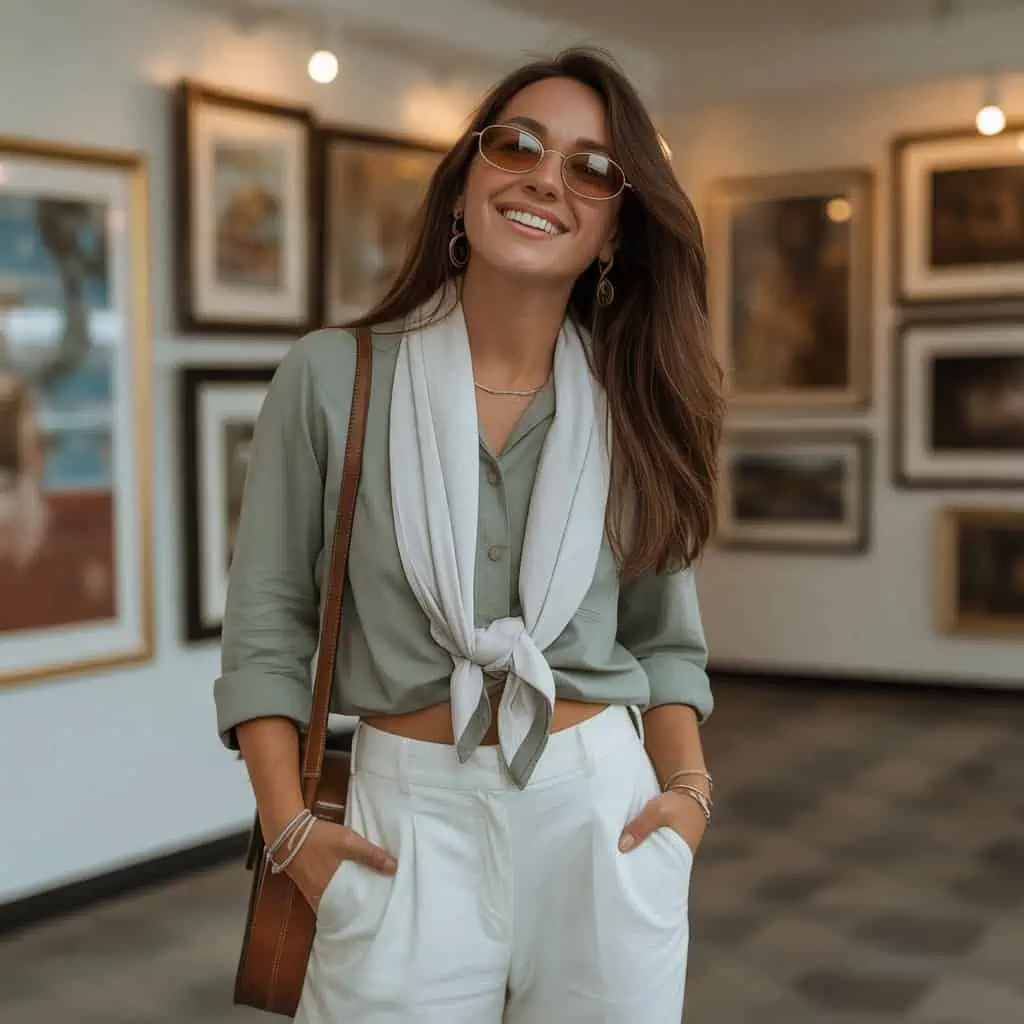 This effortlessly chic look is all about embracing simplicity while making a statement. The softly draped scarf adds a layer of sophistication without the fuss of a knot, allowing the outfit’s clean lines to shine through. Pairing a fitted green top with classic white trousers creates a timeless silhouette that flatters any body shape. The ballet flats elongate the legs for a polished finish. Accessorizing with delicate bracelets and sunglasses elevates the ensemble, showcasing that sometimes less is more. This style embodies modern elegance and captures a carefree spirit—perfect for a casual day out or a laid-back lunch date.
