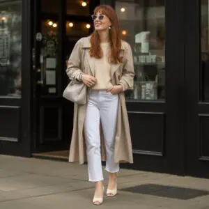 The draped-over-one-shoulder silhouette exudes an air of laid-back sophistication that’s both modern and timeless. Layering a tailored beige blazer over a classic button-down shirt creates a polished aesthetic, while the paisley scarf introduces a charming element of whimsy. This effortless draping not only showcases the scarf’s vibrant pattern but also highlights the relaxed fit of the outfit. When paired with off-white trousers and tan mules, the whole ensemble radiates understated elegance without sacrificing comfort. The gold chain necklace is a subtle touch that ties the look together, making it perfect for transitional seasons.