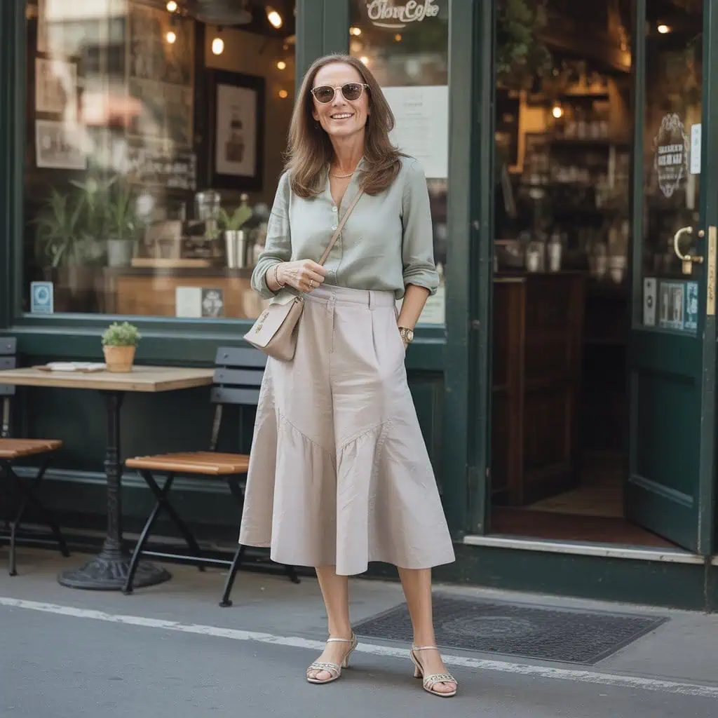 Denim has evolved from casual to chic, making a soft denim midi skirt a perfect choice for vibrant daytime outings. The light wash adds a fresh, summery vibe, while the inherent softness of denim ensures comfort. Pairing it with a tucked-in striped shirt keeps the look tailored without feeling stiff, striking the ideal balance of relaxed elegance. Kitten heels elevate the outfit, bringing in a touch of sophistication without sacrificing ease of movement. The addition of accessories like a leather handbag and sunglasses introduces an aspect of flair, creating that effortless yet polished look that’s key for style over 60.