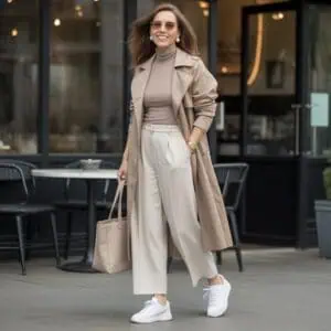 Dressing in tonal outfits is a superb way to elevate your winter coat game, and it plays beautifully into the art of monochromatic styling. Choosing shades within a similar color family creates a cohesive and polished look that feels effortlessly chic. The combination of a sleek winter coat with high-waisted wide-leg trousers in beige, complemented by white sneakers, brings simplicity and sophistication together. Accessories like champagne-tinted sunglasses add a hint of glam and keep your outfit feeling fresh. By keeping the palette neutral, you also set the stage for the coat to shine through while maintaining a stylish vibe, making it perfect for transitioning from casual outings to more formal introductions.
