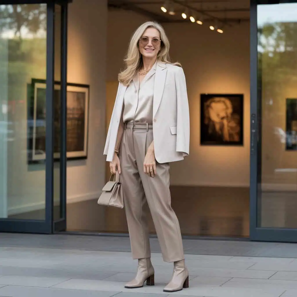 Sometimes, less truly is more when it comes to accessorizing. Choosing simple yet impactful pieces ensures you maintain an effortlessly chic aesthetic. A tailored blazer provides structure while pairing gracefully with a silk shirt and trousers for a balanced ensemble. The addition of delicate gold jewelry highlights rather than distracts, lending an air of sophistication without adding visual clutter. Boots keep the outfit grounded and practical, perfect for navigating daily life with ease. A structured beige bag not only rounds off the look but also serves as a stylish carry-all, seamlessly blending function with fashion.