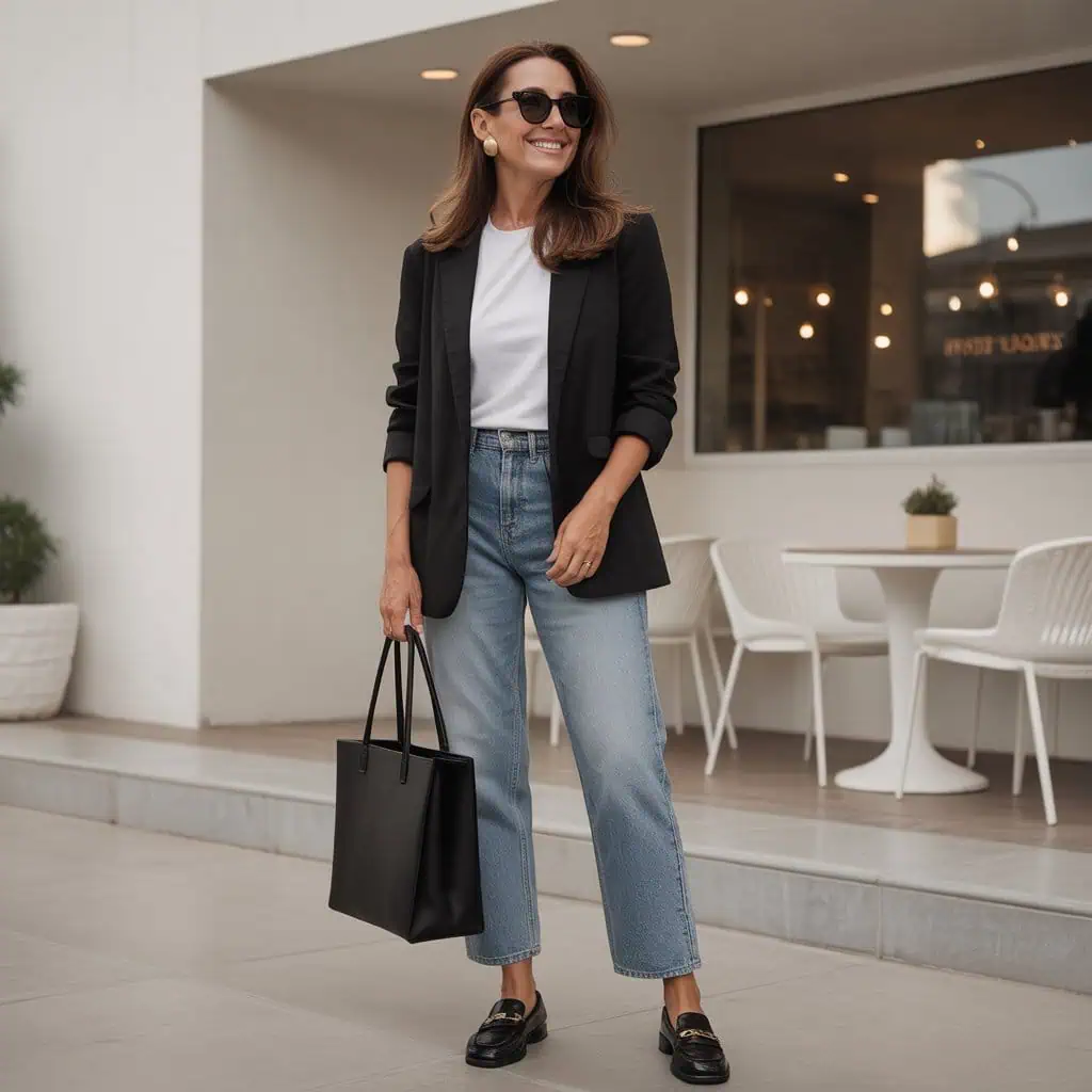 Investing in tailored basics provides a foundation for a sophisticated and versatile wardrobe. A fitted blazer transforms any outfit into a smart casual look, perfect for social gatherings or professional settings alike. The crisp white tshirt adds a refreshing touch against the tailored black trousers, creating a classic monochrome palette that’s endlessly chic. Accessorizing with understated gold jewelry elevates your outfit without overwhelming it. White loafers bring in just the right amount of sophistication while ensuring comfort. Completing the look with oversized sunglasses and a structured handbag enhances the polished vibe, making it an ideal choice for modern-day elegance.