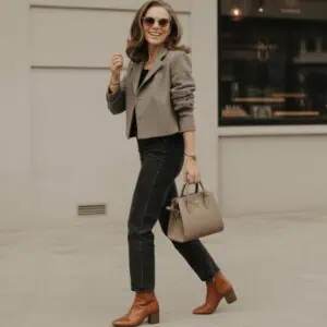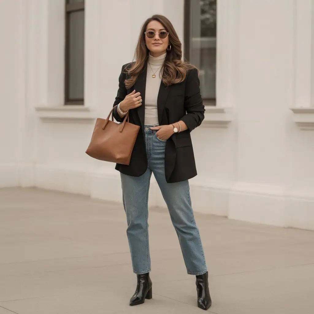 Transforming a simple outfit into a striking ensemble is all about layering with intention. Opting for a tailored black blazer over a fitted cream turtleneck not only adds dimension but also introduces a touch of sophistication that signals you mean business. This combination creates visual interest without overwhelming the eye, allowing every element to shine. The addition of straight-leg jeans keeps things relaxed yet polished, striking a perfect balance for both work and play. Accessorizing with sleek block-heel ankle boots and refined jewelry elevates the look further, proving that neutral colors can still make a bold statement.