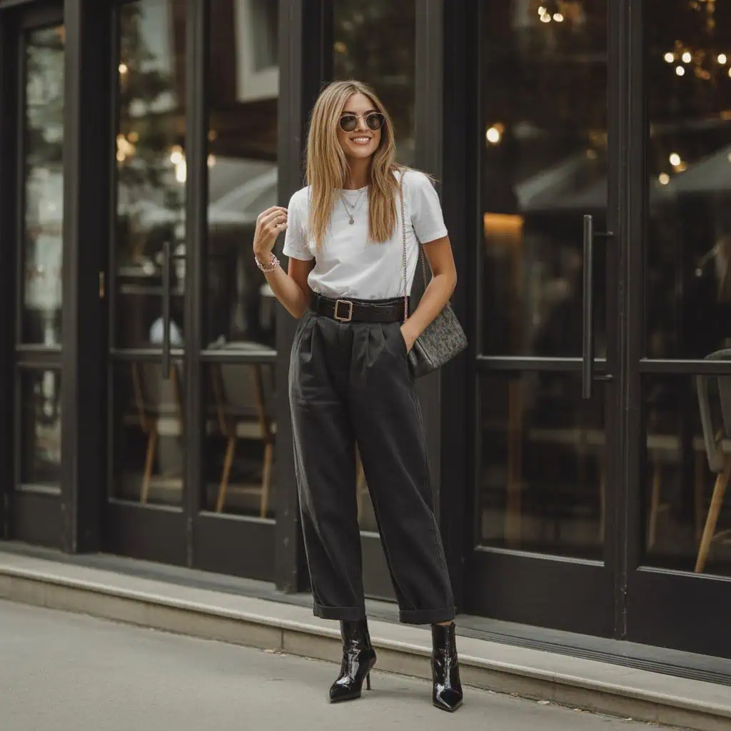 A bold belt can be the hero of an otherwise simple outfit. In this case, a classic white tee tucked into high-waisted paper-bag trousers instantly takes on a more fashion-forward flair with the addition of a statement belt. This essential accessory not only highlights the waistline but also infuses personality into a straightforward look. The contrast of the structured trousers with a casual tee strikes the perfect balance between smart and laid-back. When finished with heeled ankle boots and modern sunglasses, the ensemble feels cohesive and intentional, showcasing how a single accessory can completely define an outfit’s aesthetic.