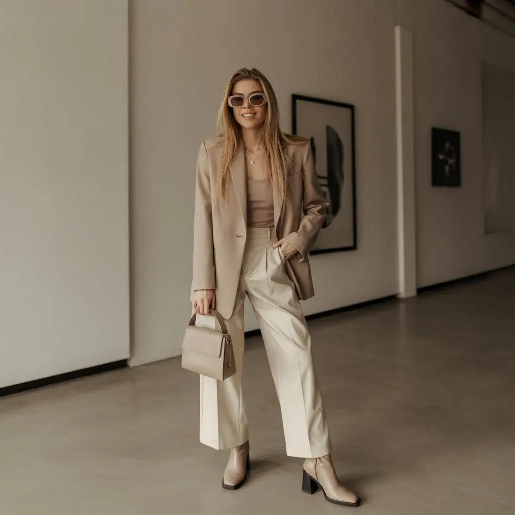 Opting for a monochrome palette is a foolproof way to elevate any outfit. When you dress in varying shades of the same color, like the warm beige ensemble here, you create a streamlined silhouette that allows for a sophisticated and intentional vibe. This technique breaks down barriers in styling, making it easy to mix textures and silhouettes without overwhelming the eye. Pairing an oversized sweater with high-waisted trousers not only elongates the figure but also adds a modern twist to a classic look. Accessorizing with minimal jewelry and structured pieces adds sophistication and keeps your outfit polished without feeling overdone.