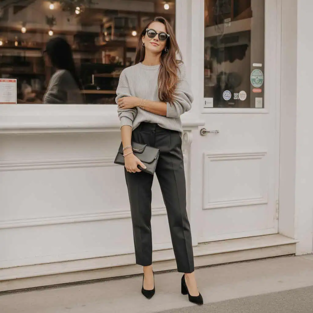 Front-tucking your knitwear can completely transform an outfit from basic to stylishly put-together. By tucking in the front of a loose gray sweater into high-waisted trousers, you achieve a nice balance between relaxed and refined. This simple styling trick accentuates the waist, creating a flattering shape that adds definition while allowing for comfort. The juxtaposition of the casual knit and trousers plays brilliantly, giving an effortlessly chic look. Complementing this with heels and delicate jewels creates harmony in the overall appearance, making it feel intended rather than thrown together.