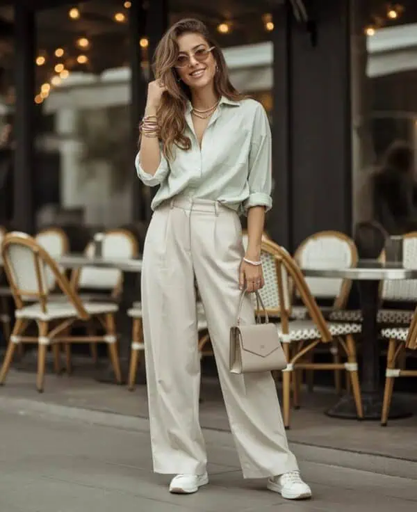 A light blue oversized button-up shirt tucked into tailored beige trousers creates a sophisticated look that’s both refined and comfortable. The oversized nature of the shirt adds a relaxed, easygoing vibe, while tucking it in showcases your waist, ensuring you still have structure. The choice of polished brown loafers not only elevates the outfit but also echoes a modern, professional aesthetic. Finishing touches like a structured handbag and stylish sunglasses enhance the chicness, making this ensemble perfect for everything from a day at the office to a weekend brunch. It’s versatile and exudes an air of confidence that’s hard to ignore.