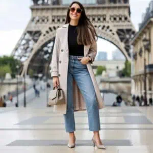 The transitional period between winter and spring calls for a savvy approach to layering, making a lightweight coat a must-have piece. This outfit brilliantly showcases how to achieve that effortless chic vibe that supermodels nail even on their days off. The olive trench adds a neutral yet unexpected touch, drawing attention without overwhelming the ensemble. Pairing it with a classic white tee and relaxed-fit jeans strikes a perfect balance between polished and casual, while white sneakers keep things youthful and modern. Lastly, a crossbody bag and stylish sunglasses bring in that laid-back, Instagram-worthy finish, ensuring you’re ready for everything from coffee runs to casual meet-ups, all while exuding effortless style.