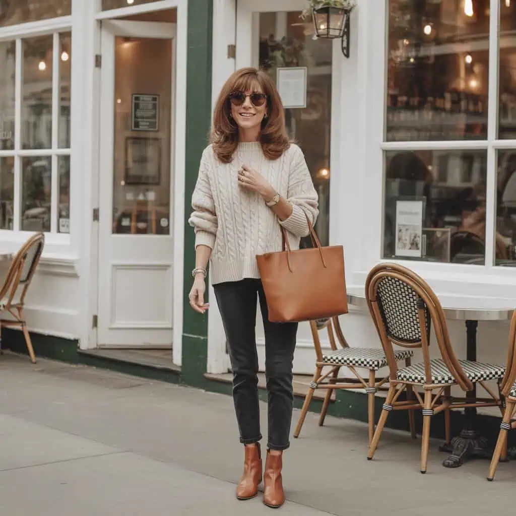 Chunky cable knits add significant bulk, especially around the chest, shoulders, and arms. When paired with slim jeans, the imbalance becomes stark—the top looks overly inflated while the bottom looks squeezed. The silhouette becomes top-heavy, which shortens the frame and widens the upper body visually. Even beautifully colored boots and bags can’t offset the dominating weight of the sweater. The outfit lacks harmonious proportion, making movement feel stiff and the overall appearance less refined.
