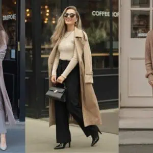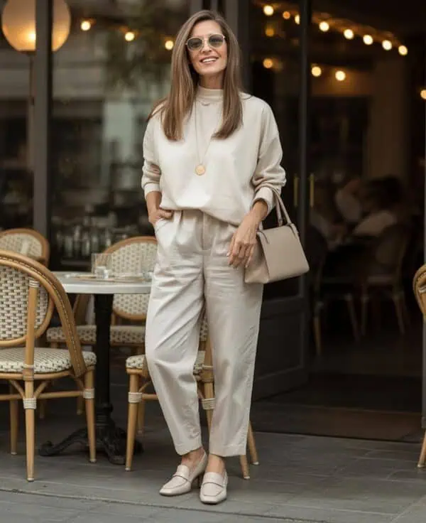 This chic layering technique of wearing a fitted turtleneck under an oversized sweater not only keeps you warm but adds a rich, sophisticated element to your look. The turtleneck’s sleek silhouette creates a nice contrast to the voluminous sweater, making for an interesting play on shapes. Relaxed-fit trousers maintain comfort while keeping the style elevated, a perfect blend for various occasions. The use of taupe ankle boots adds an earthy touch that ties the whole palette together, while neutral sunglasses lend an effortless cool vibe. This combo is ideal for those transitional days when you want to feel cozy yet stylish, embodying an effortlessly chic aesthetic.