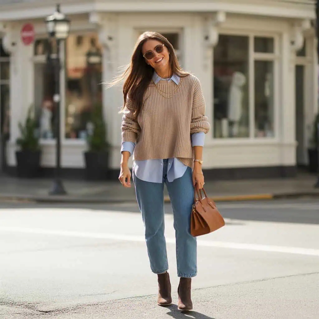 Layering a neutral sweater over a chambray shirt creates an effortlessly chic and serene look that is ideal for various occasions. The soft, earthy tones of the sweater harmonize beautifully with the light blue of the chambray, bringing a touch of relaxed sophistication that’s also versatile. Chambray’s classic texture contrasts gently with the knit, adding depth to your outfit while keeping it breathable and comfortable. Pair this ensemble with straight-leg jeans for a polished yet casual feel; the blend of structured and relaxed elements ensures you’ll look stylish without sacrificing comfort. Finishing touches like oversized sunglasses and a soft brown handbag elevate the look, making it perfect for a day out or casual meet-ups with friends.
