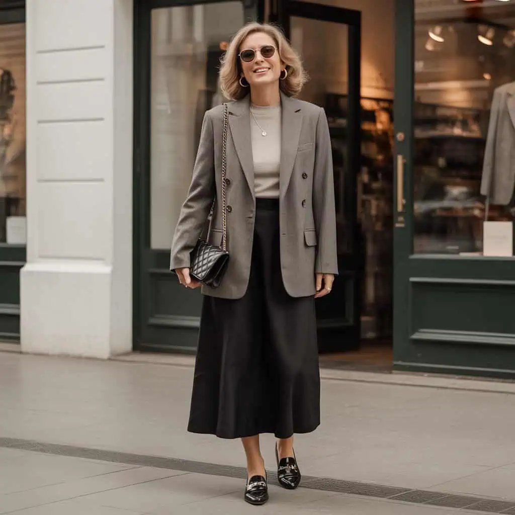 Pairing a tailored wool blazer with a knee-length skirt is the ultimate chic transitional look. The structured silhouette of the blazer provides a polished vibe, perfect for those in-between temperatures. A charcoal wool blazer effortlessly elevates a crisp white blouse, making it suitable for both casual and more formal settings. The navy pleated skirt adds a playful touch while maintaining a sophisticated edge, especially when incorporated with classic black loafers and cat-eye sunglasses. Finishing with a structured handbag and minimal jewelry brings the entire ensemble together, letting you embrace the changing seasons with confidence and style.