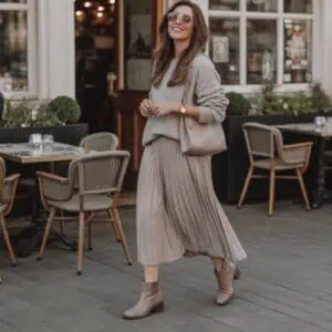 There’s something inherently chic about a cashmere sweater paired with a knee length skirt that makes it a go-to for effortless elegance. Cashmere is luxurious yet comfortable, draping beautifully over your body while offering warmth. Tucking it into a form-fitting knee length skirt accentuates your shape and creates a balanced look. The skirt’s versatile length allows for varying footwear styles; from elegant flats to ankle boots, each will change the outfit’s vibe while keeping it polished. This duo shines in soft, earthy tones—think beige and olive green—creating an inviting aesthetic perfect for brunch or a casual day out. Accessorize with statement earrings or a sleek crossbody bag to tie your outfit together seamlessly.