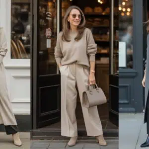 Straight-leg trousers have made a striking comeback, proving that this timeless silhouette can work beautifully for any occasion. Pairing them with sleek ankle boots elevates the look while maintaining a sophisticated edge. The sunglasses add a touch of glam that speaks to the era’s love for bold accessories. Completing the ensemble with a structured handbag and gold accents elevates the outfit, merging comfort with a dash of elegance. This combination serves as a perfect balance of refined and relaxed, embodying an effortlessly stylish vibe that’s perfect for both brunch and evening outings.