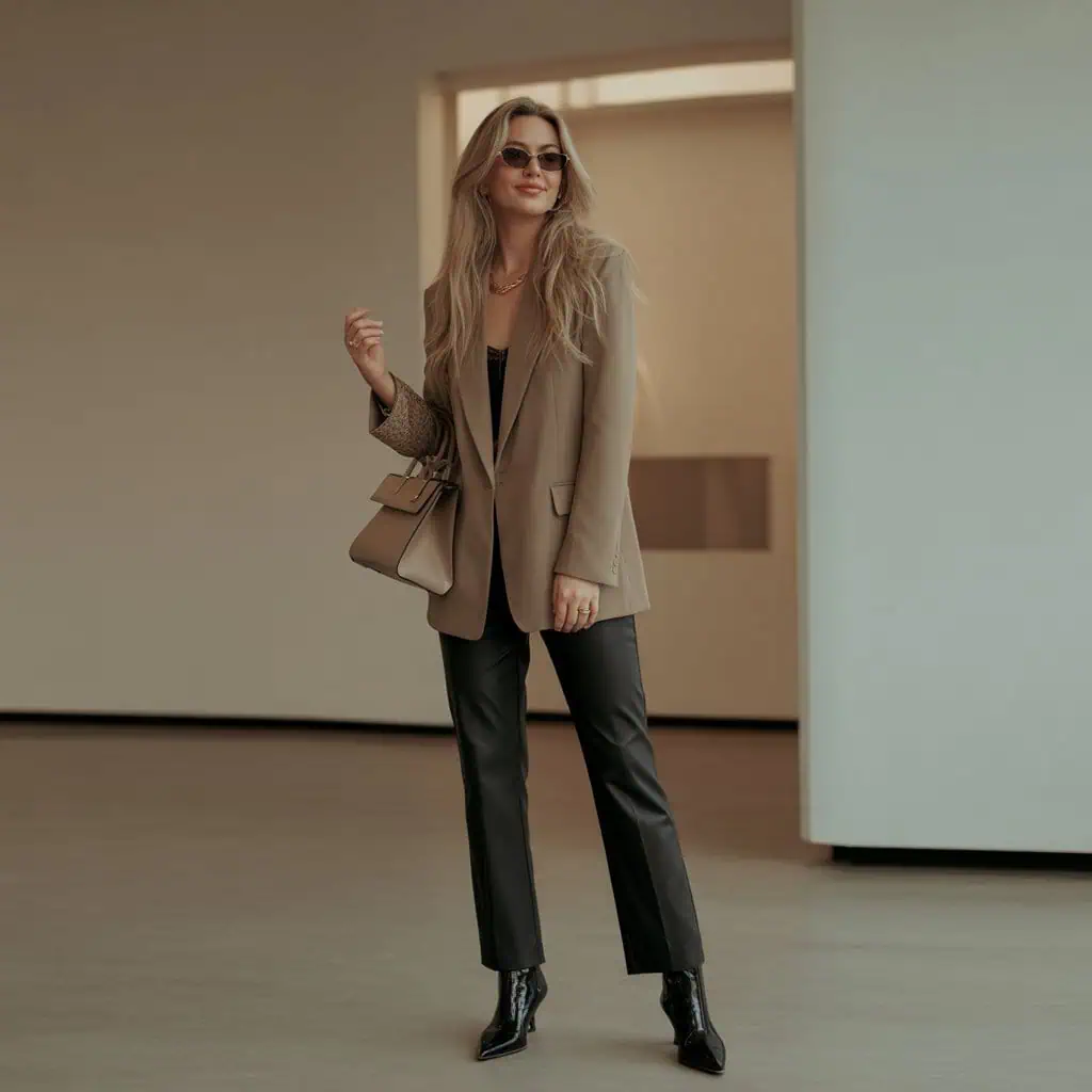 Elevate your style with tonal layers that embody effortless chic. This beige-toned ensemble showcases the beauty of monochrome dressing, allowing different textures to play off one another while creating an elongated silhouette. The fitted cream top tucked into soft taupe high-waisted trousers offers a seamless transition from day to evening, while the long cardigan drapes elegantly, adding warmth and depth. Taupe leather ankle boots anchor the look without overwhelming it, while neutral sunglasses and structured accessories maintain the polished aesthetic. The subtle gold jewelry adds just the right touch of shine, creating a warm and inviting vibe that radiates confidence.