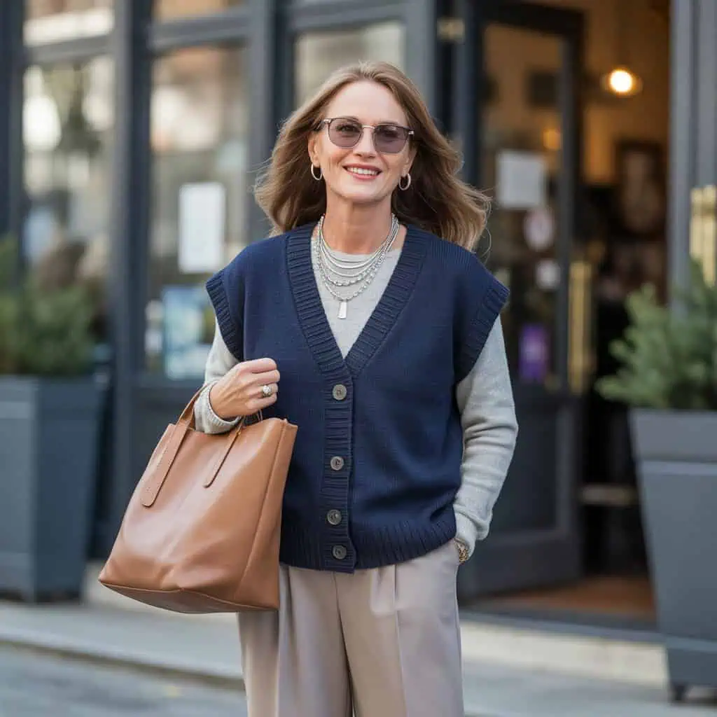 Layering is key to mastering travel fashion, and a navy wool vest over a light gray knit top strikes the perfect balance between warmth and style. This combination offers a visually appealing mix of textures that elevates your outfit from basic to chic. The vest can streamline your figure, while the soft knit provides a cozy touch that feels as good as it looks. Pair these with beige winter trousers for a subtle contrast that harmonizes well with the rest of the outfit. Cognac boots ground the look and add a touch of earthiness, while layered necklaces can effortlessly draw attention, creating a focal point that showcases your personal style. This ensemble ensures you’re ready for café conversations or art gallery visits, all while remaining polished and comfortable.