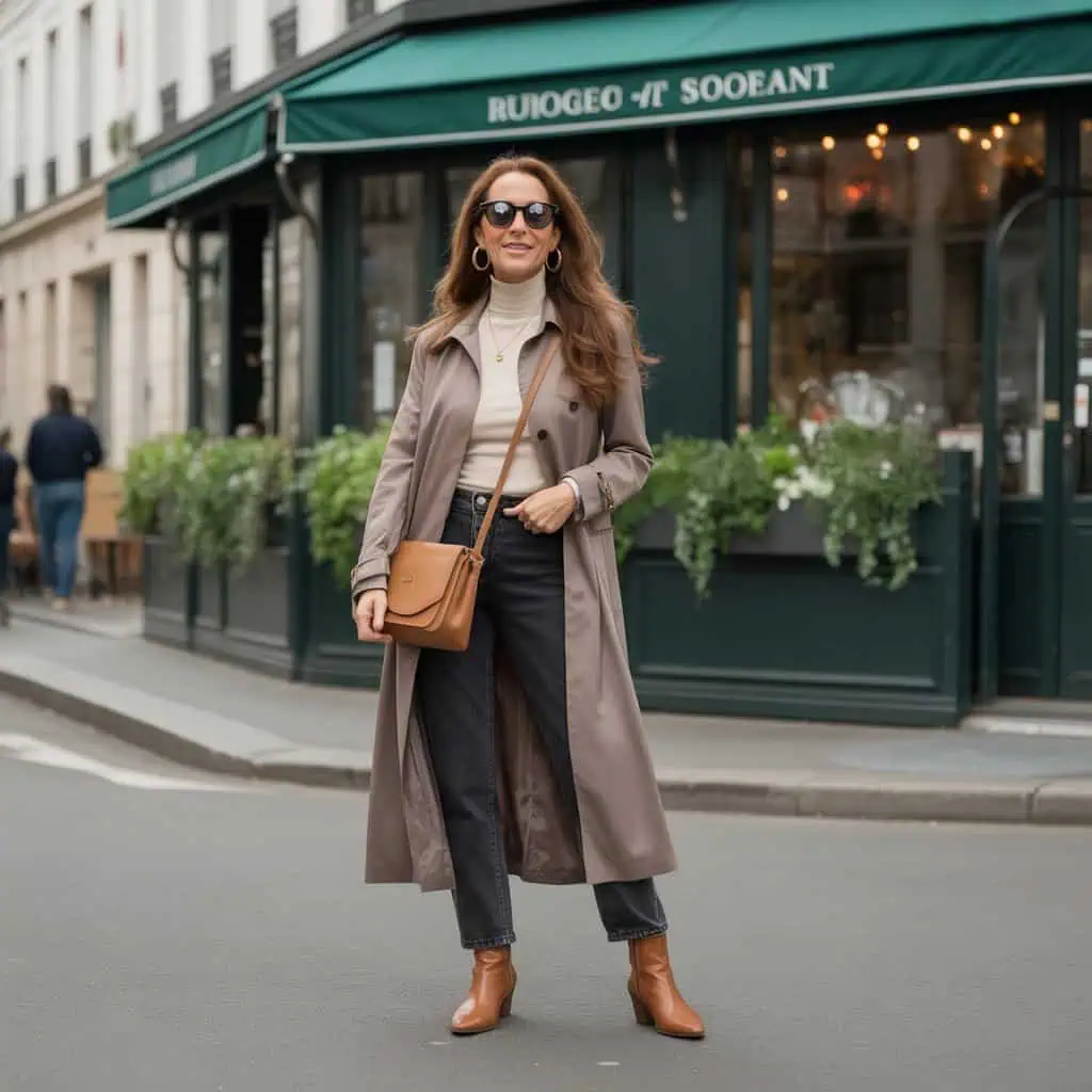 A trench coat is one of the most versatile pieces you can own, effortlessly elevating your look while providing comfort and style. Pairing it with dark straight-leg denim creates a chic balance between casual and polished. The taupe tone of the trench beautifully complements a cream turtleneck, creating a soft, sophisticated palette that flatters a variety of skin tones. The cognac ankle boots add warmth and a touch of elegance, while the camel crossbody bag keeps your essentials handy without sacrificing style. The touch of gold from the hoop earrings and the sleek black sunglasses complete this outfit, making it not only travel-appropriate but also perfect for strolling around charming streets.