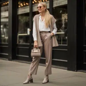 Coordinating your footwear with the overall color scheme can elevate a monochrome outfit from basic to strikingly chic. Opting for cognac leather ankle boots that mirror the hues of a minimalist light brown blazer creates a harmonious visual flow that is easy on the eyes. These clean, polished shoes not only provide continuity to the outfit but also anchor the entire look, making it appear intentional rather than thrown together. The structured handbag in a matching tone further enhances the ensemble’s refined aesthetic, ensuring the outfit remains sophisticated while keeping that editorial edge.
