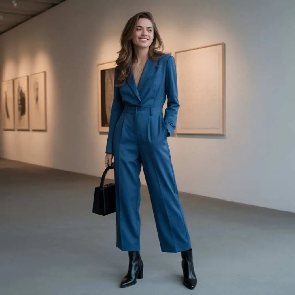 Monochrome magic truly shines when you lean into a singular color palette. This tailored all-blue jumpsuit perfectly exemplifies that, drawing attention to the elegant silhouette created by the cinched waist and wide legs. The deep blue not only flatters various skin tones but also exudes a sense of calm sophistication. Paired with sleek black leather ankle boots, the outfit strikes a dynamic contrast without breaking the color scheme. A structured handbag elevates the look, adding a touch of refinement. The visual simplicity allows for versatile styling while ensuring you radiate confidence and poise, ideal for an editorial-worthy appearance.
