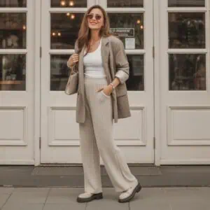 Accessories are the unsung heroes of any outfit, particularly for creating a polished look that feels intentional. Pops of color, interesting textures, or statement pieces can transform a simple outfit, like that gray blazer and white top pairing with beige trousers, into a striking appearance. Think of a bold necklace or a striking handbag; these elements bring visual interest and demonstrate your attention to detail. Even a scarf or a pair of earrings can tell a story about your personality, showcasing your unique style. So don’t shy away from layering on those accessories—they’re your chance to express creativity and ensure your outfit feels well-rounded and completed.